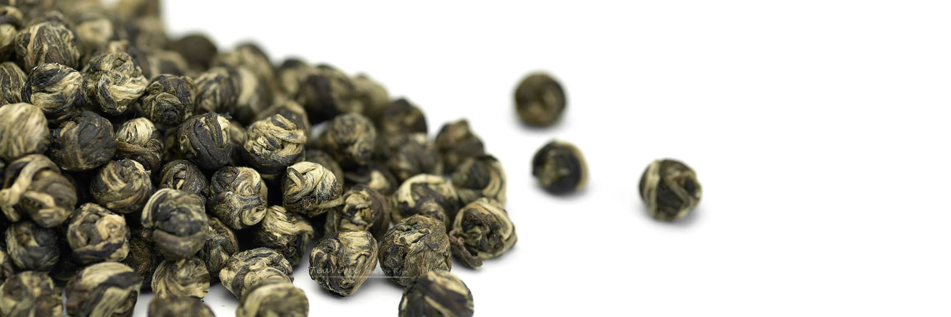 Le perle di tè verde al gelsomino sono fatte con foglie di alta montagna Jinggu Dabai Cha, prima arrotolate nella forma della perla e poi coperte dai fiori di gelsomino. Il procedimento viene ripetuto tre volte, e poi ancora una volta con i fiori di gelsomino dal profumo più forte e più ricco.
