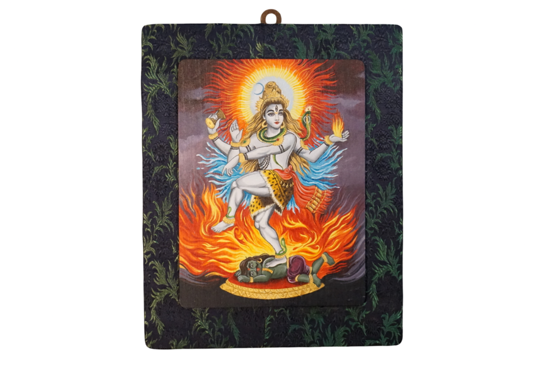 La mano destra superiore regge un tamburo, il suono primordiale da cui nasce il tempo e la creazione; quella sinistra superiore tiene una fiamma, il fuoco che porta la fine delle forme quando il loro ciclo è compiuto. Le due mani, opposte ma perfettamente equilibrate, rappresentano l’armonia dinamica degli opposti, la coesistenza di nascita e distruzione che sostiene l’universo. E mentre tutto attorno si muove, il volto di Shiva rimane sereno, imperturbabile, perché nel cuore del divino ogni polarità si dissolve e tutto ritorna all’Unità. La seconda mano destra è alzata nel gesto del “non temere”: